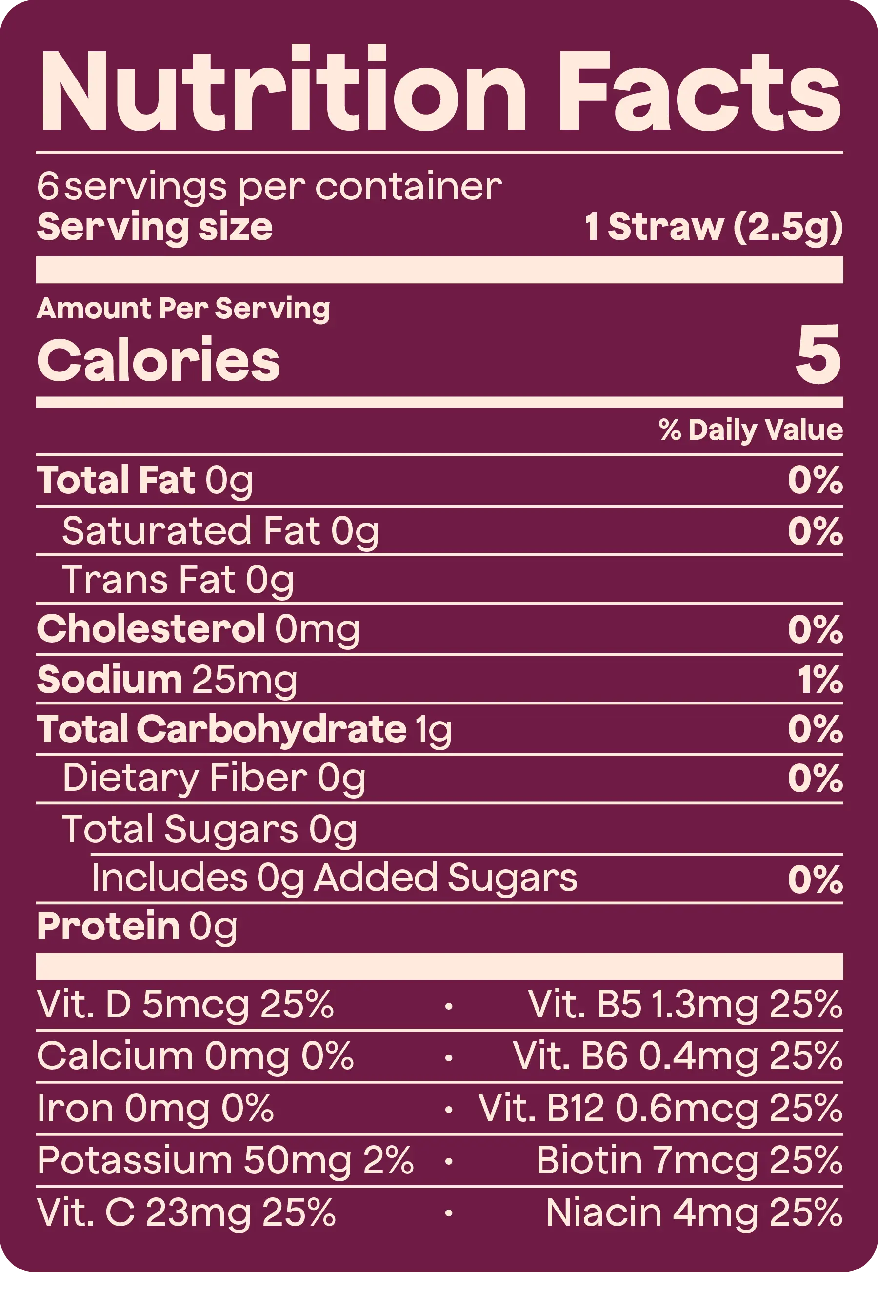Each straw is pre-filled with a precision-formulated, mindful blend of vitamins, electrolytes, and colorful flavor. Pop it open, pour it in, give it a stir (or a Twyst 😊) with the same straw until dissolved, and enjoy!